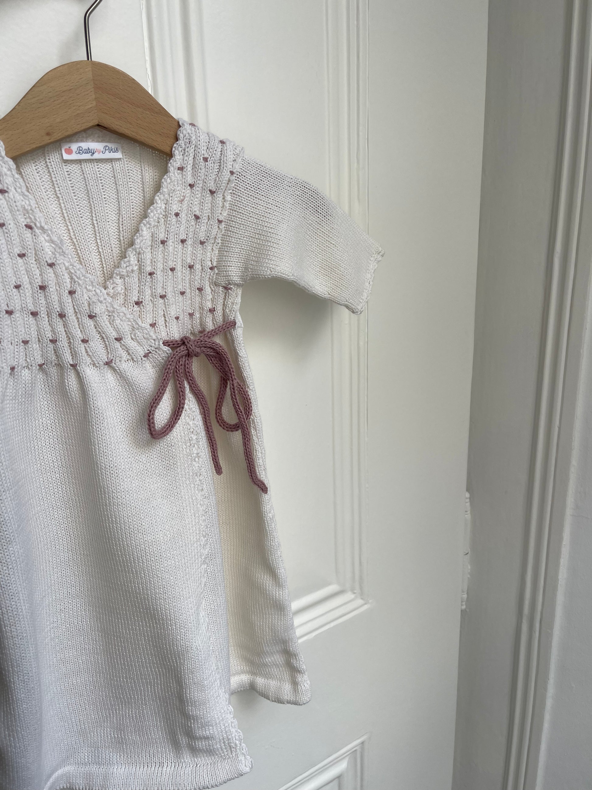 Cueiro e touca em lã com bordados em rosa velho (70% lã merino | 30% dralon).